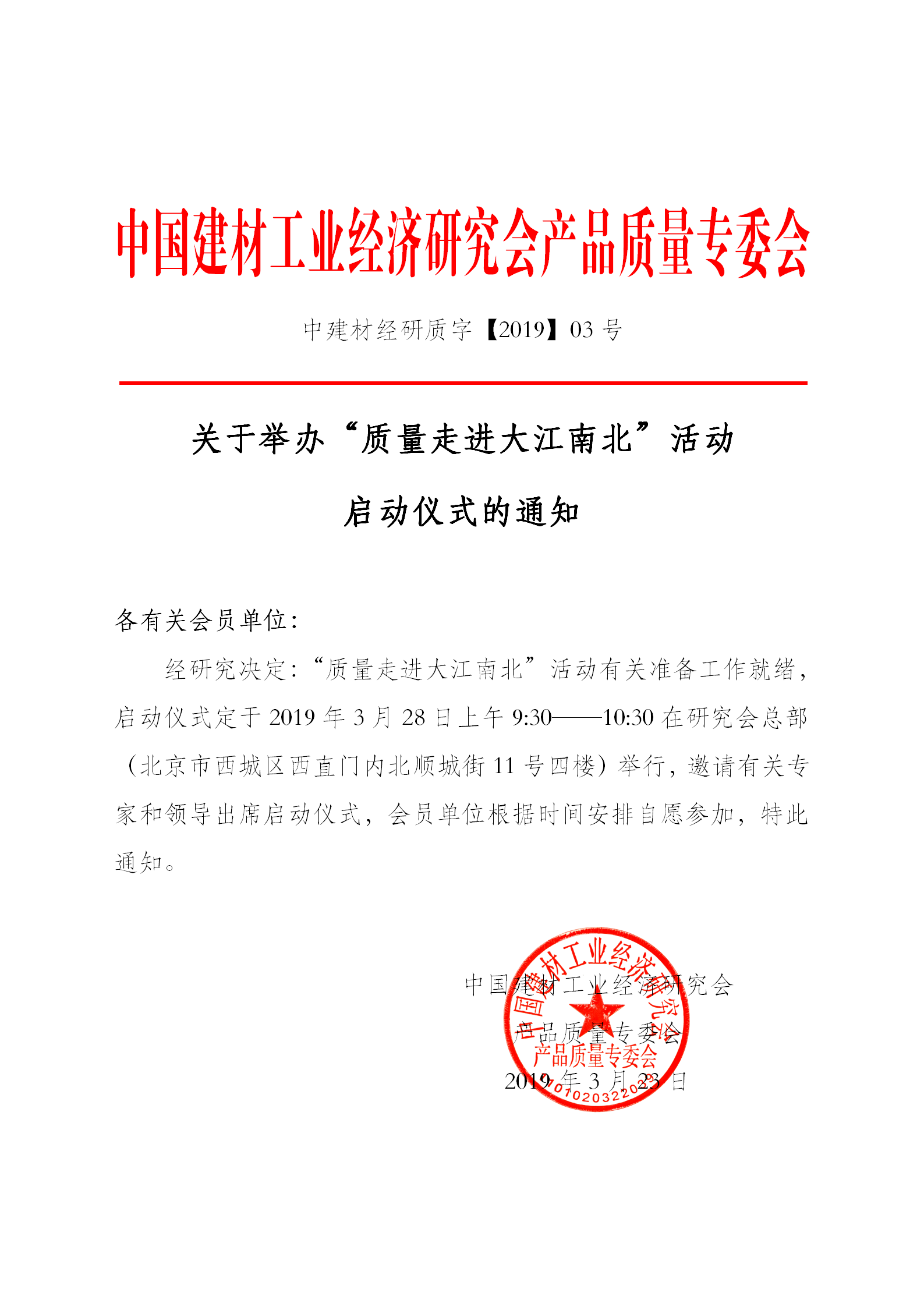 “質(zhì)量走進(jìn)大江南北”是中國建材工業(yè)經(jīng)濟(jì)研究會(huì)產(chǎn)品質(zhì)量專委會(huì)信息傳媒部一項(xiàng)公益性欄目,“質(zhì)量走進(jìn)大江南北”啟動(dòng)儀式將于2019年3月28日上午在研究會(huì)總部舉行。委托理事單位京港視通傳媒(北京)有限公司(簡稱“京港視通”)作為“質(zhì)量走進(jìn)大江南北”欄目的運(yùn)營單位。通過對(duì)會(huì)員單位、業(yè)務(wù)主管單位及有關(guān)單位的實(shí)地走訪和信息調(diào)研,打造專注建材行業(yè)產(chǎn)品質(zhì)量提升的宣傳欄目。主要以建筑建材行業(yè)的優(yōu)質(zhì)企業(yè)(產(chǎn)品)為欄目推廣對(duì)象,實(shí)地采訪形式宣傳、推廣企業(yè)及產(chǎn)品的品牌形象,提高企業(yè)知名度,擴(kuò)大企業(yè)在行業(yè)的影響力,追溯企業(yè)的先進(jìn)管理思路和經(jīng)營理念,為同行或企業(yè)界提供啟示,為行業(yè)樹立標(biāo)桿,從而達(dá)到弘揚(yáng)高質(zhì)量發(fā)展、傳播行業(yè)正能量發(fā)展,逐步提升整個(gè)建材行業(yè)產(chǎn)品質(zhì)量的目的。