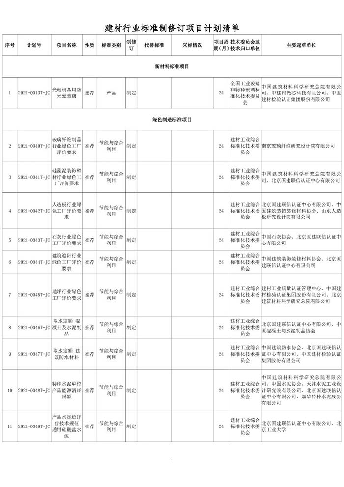 工業(yè)和信息化部辦公廳近日印發(fā)了2021年第一批行業(yè)標(biāo)準(zhǔn)制修訂和外文版項(xiàng)目計(jì)劃(工信廳科函〔2021〕25號(hào)),本批行業(yè)標(biāo)準(zhǔn)制修訂項(xiàng)目計(jì)劃共521項(xiàng),其中,由中國建筑材料聯(lián)合會(huì)提出的共有45項(xiàng)(見附表)。